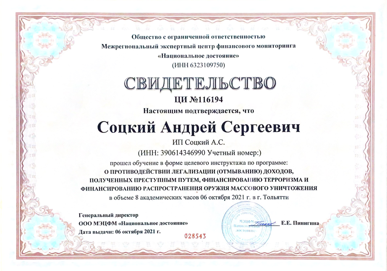 - имя и фамилию Пользователя,